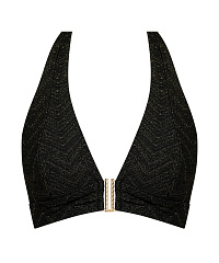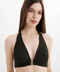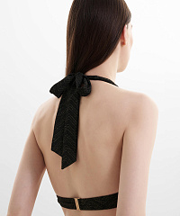 Жаккард с люрексом улавливает каждое движение, создавая эффект мягкого сияния, а шевронный рисунок подчеркивает изгибы и визуально вытягивает силуэт. Витое золотое украшение задает структуру и добавляет графичности, превращая купальники в почти ювелирные объекты. Смелые вырезы, чистые линии и продуманная посадка делают линию одновременно выразительной и функциональной. Линия Golden Horizon про дерзкую, сияющую женственность, которую видно издалека.