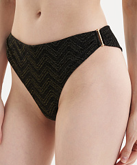 Жаккард с люрексом улавливает каждое движение, создавая эффект мягкого сияния, а шевронный рисунок подчеркивает изгибы и визуально вытягивает силуэт. Витое золотое украшение задает структуру и добавляет графичности, превращая купальники в почти ювелирные объекты. Смелые вырезы, чистые линии и продуманная посадка делают линию одновременно выразительной и функциональной. Линия Golden Horizon про дерзкую, сияющую женственность, которую видно издалека.