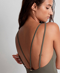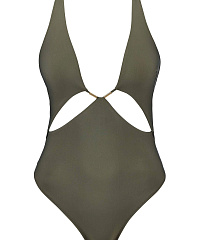 - Глубокий вырез с декором в виде золотистых цилиндров