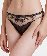 Трусы танга от бренда AUBADE выполнены из соблазнительного полупрозрачного тюля. Модель украшена изящной вышивкой с цветочными мотивами. В пару к трусам можно подобрать бютгальтер из той же линейки для создания готового комплекта.